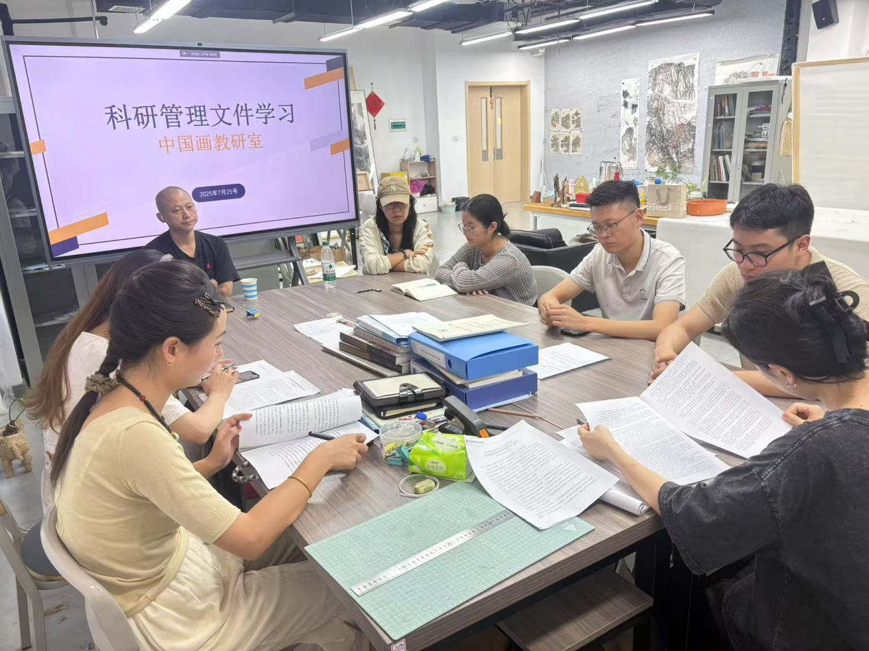 根据科研处相关安排,7月25日(周五)上午十点,美术学院中国画教研室召开关于组织学习相关科研管理文件会议。会议由教研室主任罗守俊主持,美术学院院长束新水、中国画教研室全体成员参会。