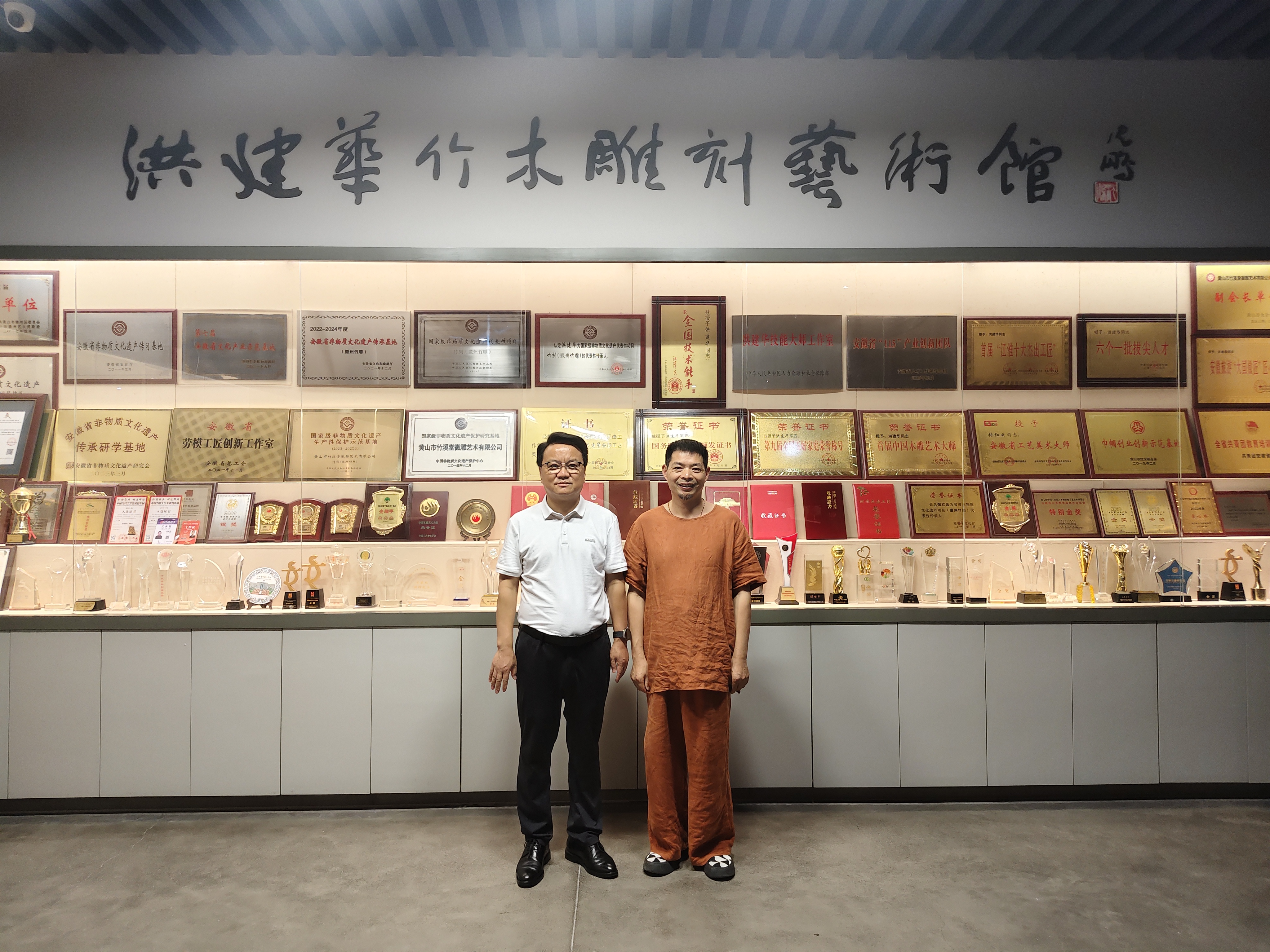 期间,美术学院一行还专程拜访国家级非遗传承人洪建华和国家级乡村工匠名师张硕。在洪建华竹木雕刻艺术馆,双方探讨竹雕艺术与当代美术创作的融合可能,思考如何将非遗元素融入教学,同时为艺术人才培训项目申报梳理非遗技艺的教学转化路径。