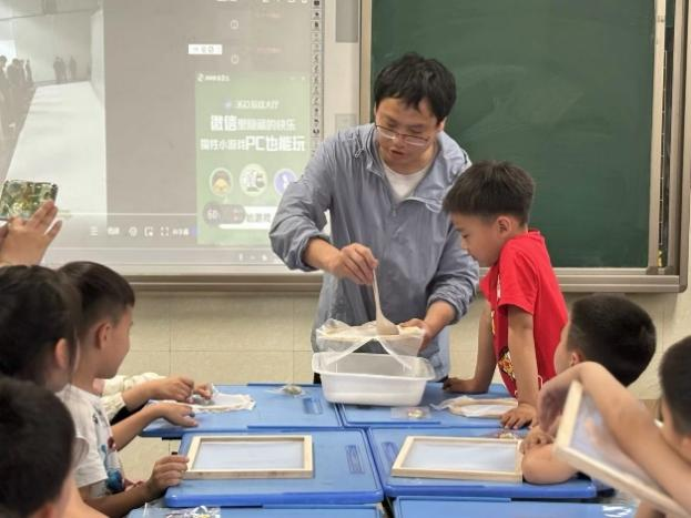 非遗教研室专任教师吴又进以“书写载体演变史”为切入点,结合考古实物与工艺调查,讲述造纸术诞生背景:从甲骨、竹简到蔡伦革新造纸工艺,孩子们通过西汉“灞桥纸”等文物影像,直观感受“一张纸承载的文明跨越”。