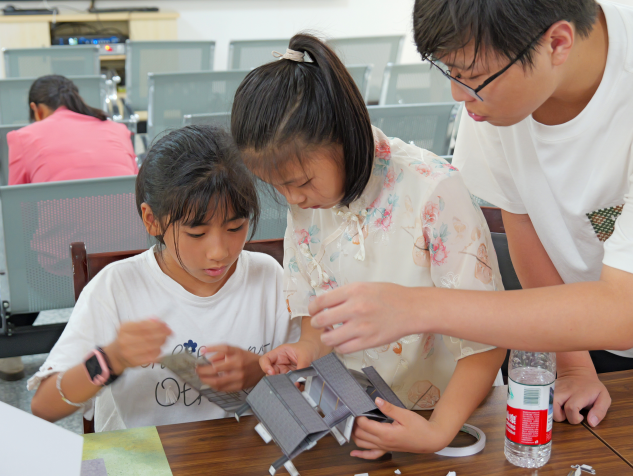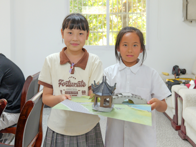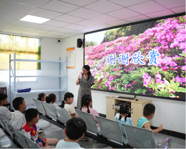 校妇联副主席茆建琳则带领村里的女性群体学唱黄梅戏,经典的唱腔与婉转的旋律让大家感受传统戏曲的魅力,现场氛围轻松愉悦;另一边,设计学院学生为小朋友们带来了生动的徽州建筑文化科普,通过图文讲解与模型制作,让孩子们了解家乡传统建筑的独特韵味;校妇联副主席张丽丽教唱红歌,孩子们稚嫩的歌声中充满了对祖国的热爱,红色旋律在乡村上空回荡。