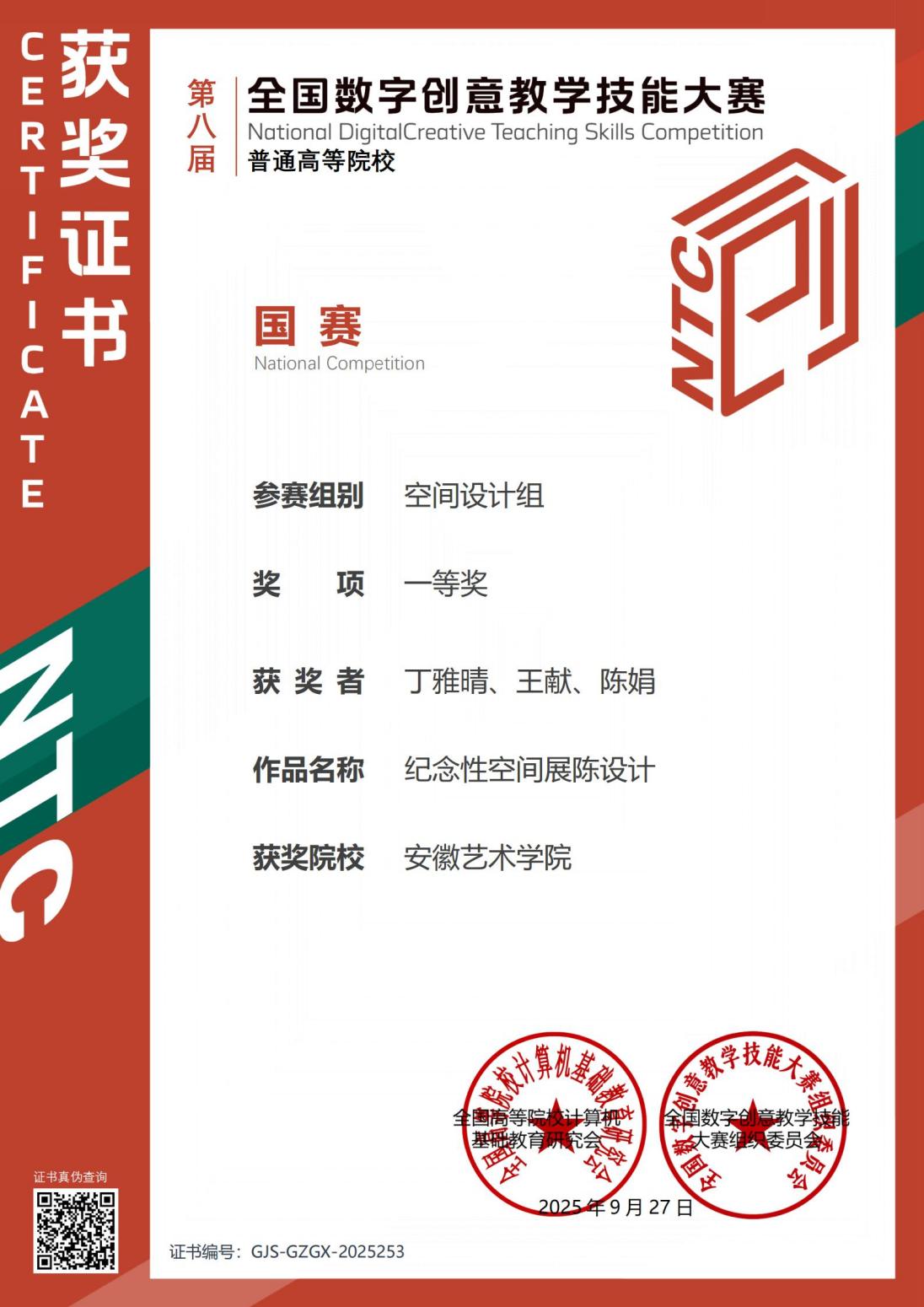 近日,由中国好创意大赛组委会主办的第八届全国数字创意教学技能大赛(National Competition for Digital Creative Teaching Skills,简称NCDCTS)圆满落幕。经过多轮激烈竞争,设计学院环境设计专业丁雅晴老师主讲的课程作品《纪念性空间展陈设计》脱颖而出,荣获空间设计组全国一等奖,充分展现了设计学院在教学改革与数字创意融合方面的卓越成果。