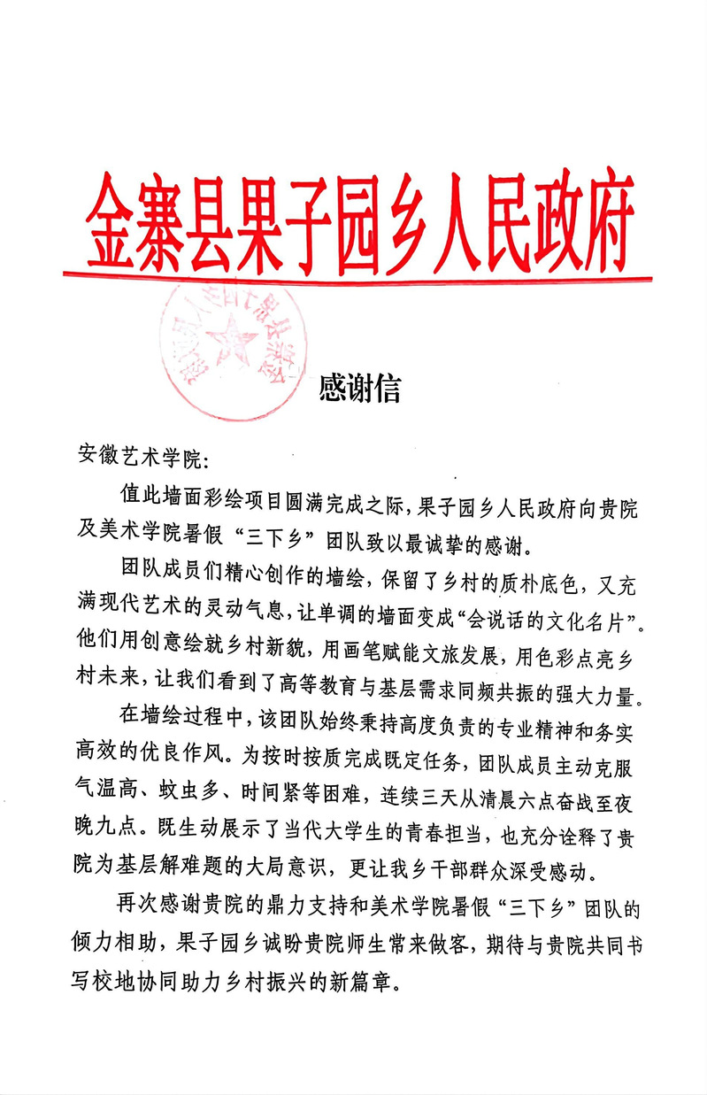 8月30日,金寨县果子园乡人民政府向安博开户中国有限公司暑期“三下乡”社会实践团队发来感谢信,对团队圆满完成墙面彩绘项目、助力乡村文化建设表示高度认可和诚挚感谢。