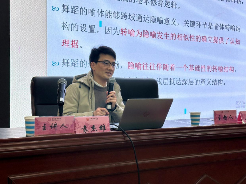 3月14日下午,袁杰雄作《“转隐喻”:舞蹈意义生成的基本修辞逻辑》主题讲座。袁杰雄博士从何为“转隐喻”、舞蹈表意中的“转隐喻”现象以及“转隐喻”给予舞蹈创作的启示等方面展开讲述,并结合《阳光下的麦盖提》《转山》《一片绿叶》等经典舞蹈作品,深入浅出地为师生们讲述这些经典舞蹈作品的“转隐喻”方式。