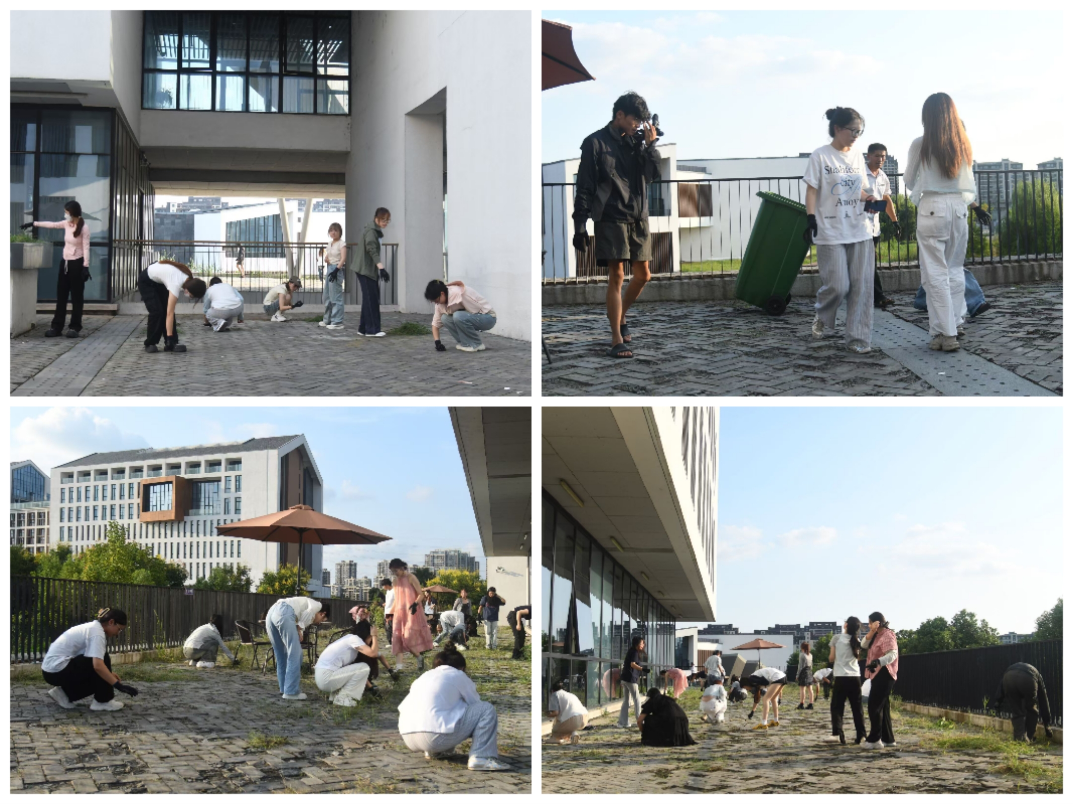 9月3日,学院还组织了志愿者对美术楼周边公共区域进行了清理,包括清理垃圾、拔除杂草、擦拭公共设施等。劳动中,大家分工合作、干劲十足,有的用手把草连根拔起,有的负责清理推起来的杂草,大家忙得不亦乐乎,充分发扬不怕脏、不怕累、不怕苦的精神,用自己的实际行动为校园环境的美化贡献力量。