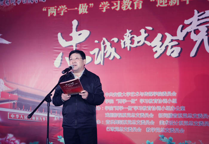 学院党委书记、院长周之虎教授致辞,他指出,自“两学一做”学习教育开展以来,我院严格按照中央和省委的决策部署,认真谋划,狠抓落实,并取得实效。“微宣讲”、“微电影”的录制,受到了上级表彰,且先后成功举办“庆七一,唱支山歌给党听”大型文艺汇演、“国庆暨迎接省第十次党代会”书画展,彰显了艺术类院校开展“两学一做”学习教育的特色和亮点,反响热烈。