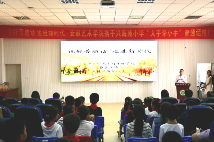 10月9日下午,安徽大学艺术与传媒学院新闻播音系、音乐舞蹈系、戏剧影视系共20多名师生在学院语委主任张晶,副主任韩大国、王琍琍的带领下来到了位于合肥市新站区的兴海苑小学,与该校100多名学生共同开展“大手牵小手 推普进小学”活动。