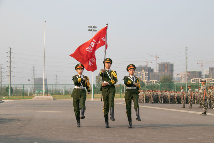 随后,身穿礼宾服的新生擎着校旗、踢着正步庄重入场,拉开了本次军训汇报会的序幕。745名参训同学以连为单位分别展示了分列式、军体拳、韵律操、齐唱军歌等项目,步伐整齐、意气风发,展示了安艺学子饱满的精神面貌,体现了本次军训丰硕的成果。