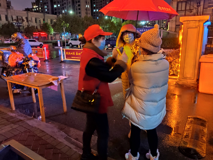 在社区,孔令莹每天工作的主要内容是登记人员进出、测量体温、劝诫居民少出门、一定要戴好口罩等。有的居民不理解,孔令莹会保持微笑和礼貌,一遍一遍耐心劝导。有一回,一位女士因社区限制无法出门,对站岗的志愿者们恶语相向。孔令莹安慰自己,这种时候,人们的情绪容易急躁;我这样做是在保护她,晚些时候,她能想明白的……“最难捱的是晚上站岗,”孔令莹说,“真的太冷了,一直站在室外,有时候又刮风又下雨,裹着长羽绒服也冻得直哆嗦。”