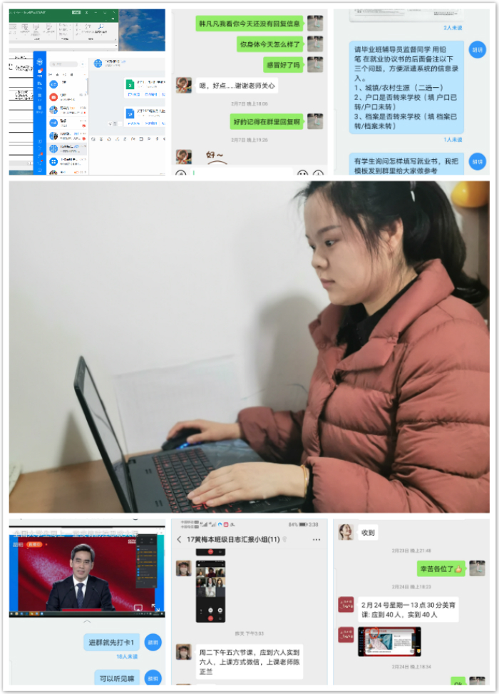 疫情当前,胡玥随时待命,时刻守在“线上”,每日主动做好疫情日报、学生心理疏导等日常工作。她保持与学生干部、党(团)员、寝室长及家长在线沟通,多渠道开展线上工作,通过微信、电话、钉钉视频班会,传达疫情防控要求,引导学生用理性和客观的态度对待当前发生的一切。同时每日收集最新疫情防控知识,在线答疑解惑,有效跟进感冒发烧学生的病情以及恢复情况,为同学们送上来自辅导员的温暖叮嘱。