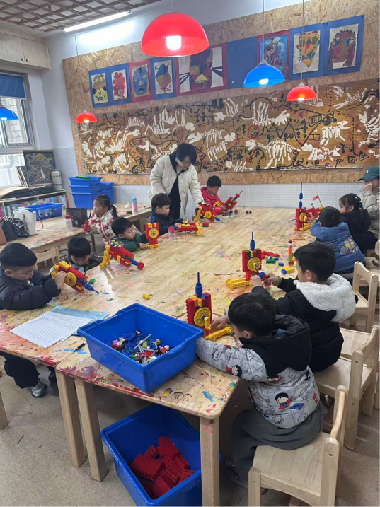 活动中,学生们充分发挥专业特长,精心准备了“奇趣大颗粒”手工课程。从色彩搭配到造型设计,耐心细致地引导小朋友们发挥想象力,用手中的大颗粒积木搭建出心中的奇妙世界。小朋友们热情高涨,积极参与,有的搭出了梦幻城堡,有的则创造出独特的机器人造型。