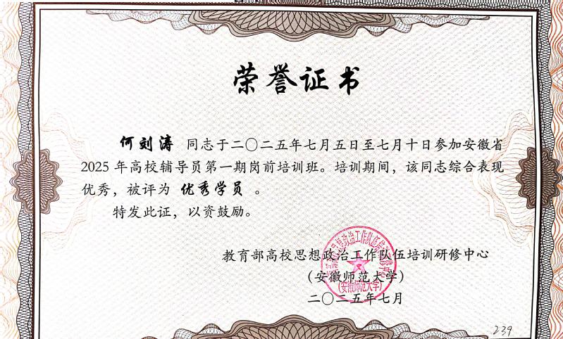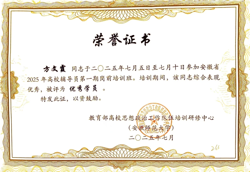 为全面提升学校思想政治工作队伍的专业素养与履职能力,切实推动思想政治工作高质量发展,助力新入职辅导员更好应对新时代学生工作中的新问题、新挑战,7月4日至10日,学校选派杨瑞铭等5位新入职辅导员,赴教育部高校思想政治工作队伍培训研修中心(安徽师范大学)参加第一期岗前培训。