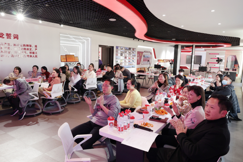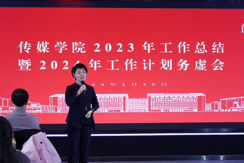 传媒学院党总支书记、院长蔡正兰在讲话中以“动车组”为喻,鼓励学院每名教职工在2024年继续精诚合作、全力发动,实现更好更快发展的目标。