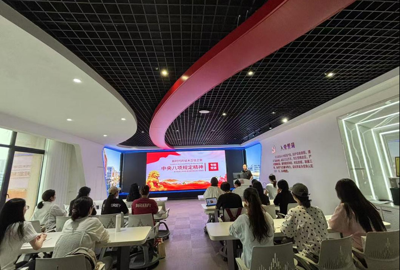 6月10日,传媒学院党总支副书记张雷雷在传媒学院VR党建活动室,为发展对象、学院学工队伍讲授中央八项规定精神专题党课。