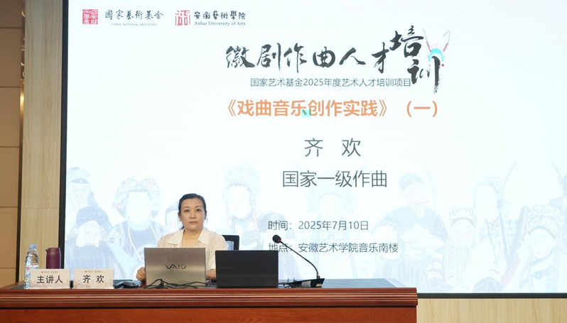 聚焦传统戏曲元素与现代创作思维的碰撞。课程第一章解析京剧唱腔结构,从词格(基本格式与变化格式)、唱句(分句及变化格式)、上下句(构成与基本类型)等方面展开。讲解后,齐欢教授现场带领学员进行乐句变化练习,随后进一步讲解唱腔结构的变化,并通过《林祥谦》《江海风流》等不同结构的实例,帮助学员深化理解。