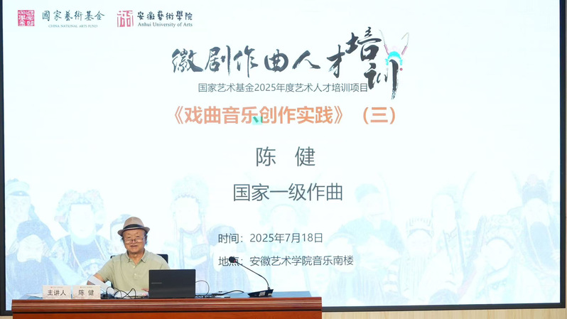 课程首先梳理了中国戏曲音乐的历史脉络,阐明中国戏曲是融合文学、音乐、舞蹈、美术的综合性艺术,由劳动人民创造,属音乐与戏剧结合的艺术形式。课程强调,戏曲舞台表演与音乐密不可分,戏曲音乐包含声乐,且会依据人物角色行当等进行创作,如《老侉头》便由皖北曲牌发展而来。陈健还对安徽北方戏曲剧种展开分析,提出应结合地理分化认知安徽戏曲,并赏析了泗州戏《小女婿》的扬腔及《李双双》选段“走过一洼又一洼”。