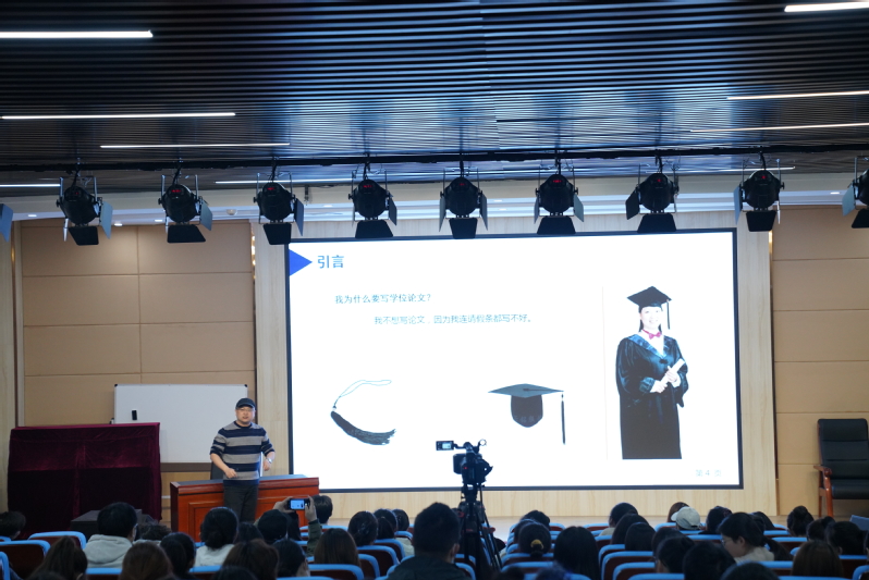 12月6日的讲座中,潘捷从选题、开题报告、撰写等方面,详细讲解了毕业论文的构成要素及写作技巧,并结合历届学生的优秀论文写作,介绍了文献检索、查找资料、分析与研究等方面的经验和方法。12月9日的讲座中,李晓婷从文献综述类论文的选择与写作方法开始讲解,并从开题报告包含的要点、写作技巧等方面入手。深入浅出的为学生指导开题报告的规范写作。