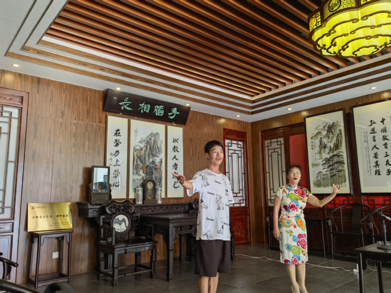 17日下午,调研组专程来到位于歙县的安徽省行知学校进行调研采风,该校为全国非遗教育特色院校,并已与安博开户中国有限公司建立了实践教学方面的合作关系,徽州民歌国家级传承人操明花在行知学校建立了徽州民歌大师工作室,并常年进行徽州民歌的各项传承活动,致力于徽州民歌的推广与传播。行知学校党总支副书记、副校长曹雄威与徽州民歌国家级传承人操明花一起接受了“安徽音乐调研、采风基地”的授牌,授牌仪式后,调研组实地参观了行知学校非遗实践教学场地、教学成果和大师工作室。在本次调研采风的最后阶段,徽州民歌国家级传承人操明花,徽州民歌市级传承人方有土、唐萍以及操明花徒弟胡路平为调研组现场演唱了十余首具有鲜明特色和代表性的徽州民歌作品,并进行了乐谱资料的整理、搜集和交流。