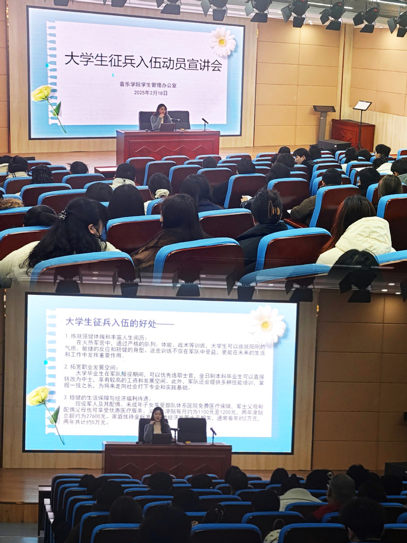 为深入贯彻落实国家征兵政策,激发大学生的爱国热情和责任担当,2025年2月18日,音乐学院在音乐南楼报告厅开展2025年春季大学生征兵入伍动员会。随着征兵季节的到来,学院领导高度重视,学生管理办公室通过线上线下相结合的方式,向全体大四学生宣传征兵政策、普及国防知识,鼓励学生在报效祖国的伟大事业中贡献自己的力量。