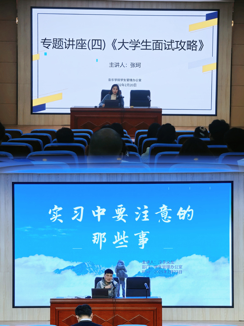讲座的首场于2月18日在音乐南楼报告厅举行,由专职辅导员张珂主讲,主题为《大学生面试攻略》。张珂老师详细讲解了面试前的准备工作、面试中的注意事项以及面试后如何跟进等内容,帮助同学们提高面试成功率。讲座的第二场于2月19日由学生管理办公室副主任淳于义龙主讲,主题为《实习中要注意的那些事》。淳于老师从实习前、实习中和实习后的各个阶段,详细阐述了学生在实习过程中应当注意的事项,帮助同学们顺利适应职场环境。