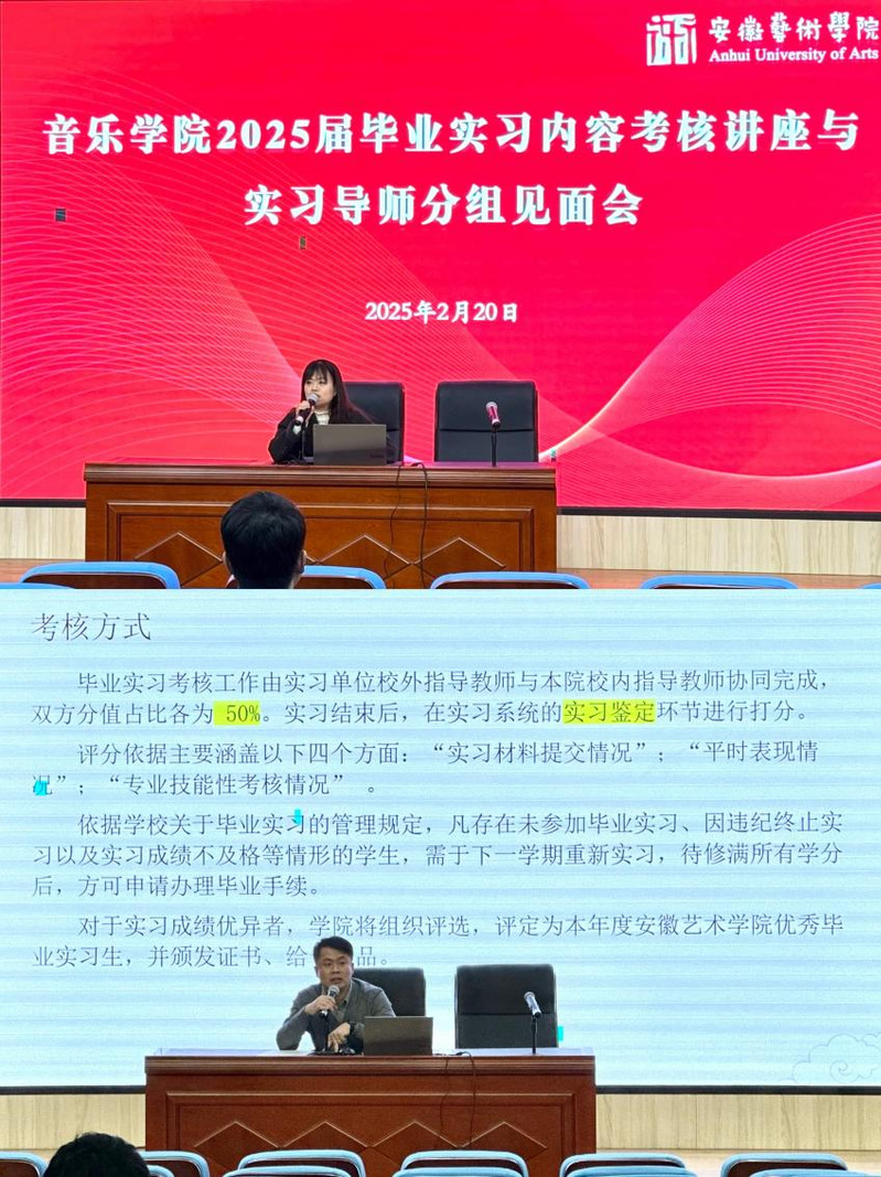 2月20日下午15:00,音乐学院在音乐南楼报告厅成功举办2025届毕业实习内容考核讲座及实习导师分组见面会,讲座由教科研办副主任朱临吉主讲,全体实习指导教师与2025届毕业生共同参会。