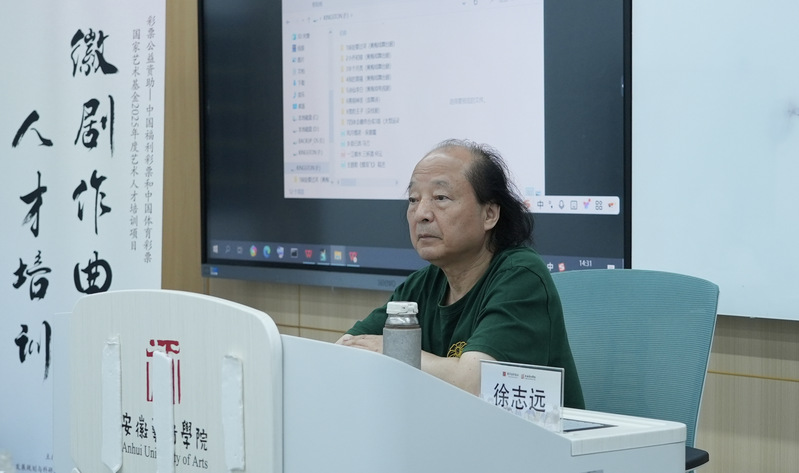 下午,著名黄梅戏作曲家、安徽国乐研究院院长徐志远以《戏曲音乐创作理论与实践》为题开展教学。