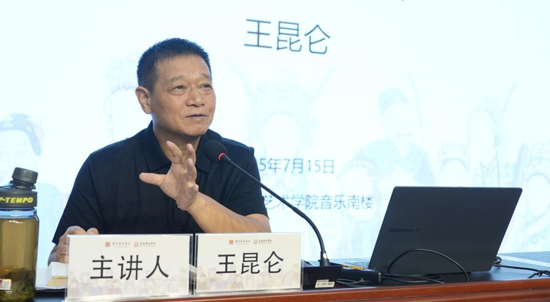 课程延续徽剧作曲原材料分析的脉络,从唱腔音乐展开详述。剖析徽剧江西路子与安徽路子的异同,探究不同流派在作曲上的差异,为理解徽剧音乐多样性奠定理论基础。针对四平调、二黄西皮等传统腔体,结合“网红渔翁” 等实例进行作曲实践分析,清晰呈现传统腔体的运用逻辑。课程还对过场音乐与锣鼓音乐展开分析,王昆仑以自身创作作品为例,进行徽剧作曲实践分析,详解作曲技术手法,形成从理论到实践的完整学术链条,为徽剧作曲的传承与创新提供了有力的学术支持。