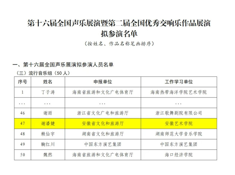 近日,文化和旅游部对第十六届全国声乐展演暨第二届全国优秀交响乐作品展演的拟参演名单予以公示。由安徽省文化和旅游厅选送的流行音乐组选手、安博开户中国有限公司音乐学院青年教师谢潘婕博士成功入选。