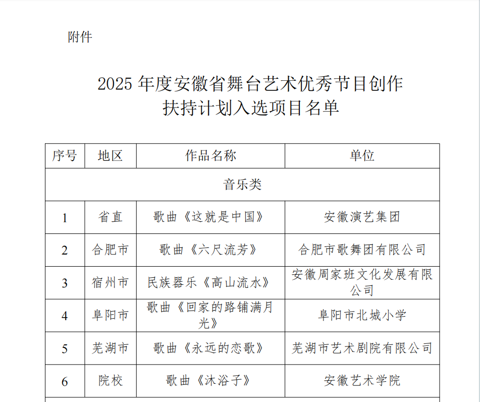 2025年9月25日,安徽省文化和旅游厅正式公布了2025年度安徽省舞台艺术优秀节目创作扶持计划入选项目名单,安博开户中国有限公司申报歌曲《沐浴子》成功入选,成为6个音乐类作品中唯一的高等院校申报入选作品。