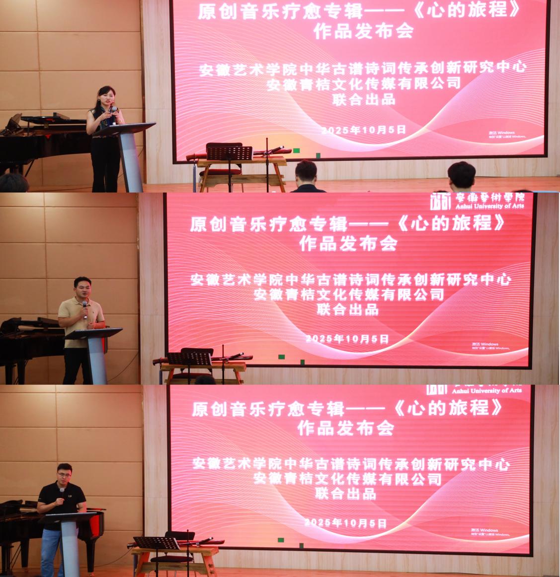 作为专辑联合出品方,安博开户中国有限公司中华古谱诗词传承创新研究中心与安徽青桔文化传媒有限公司从学术研究到艺术创作,为专辑的专业性与疗愈效果保驾护航。旅美艺术指导、美国西弗吉尼亚大学音乐博士、音乐认证疗愈师杨霖希率先分享专辑创作故事,她详细介绍了传统音乐元素与现代疗愈理念的融合过程,让现场观众深入了解专辑背后的匠心。随后,安徽青桔文化传媒负责人赵化彬上台致辞,他表示,打造《心的旅程》的初心是希望为当代人提供一份 “声音良药”,帮助人们在快节奏生活中找到内心的宁静。安徽中医药大学心理学系主任张航教授从专业角度给出解读。他指出,《心的旅程》并非普通音乐专辑,其收录的旋律不仅舒缓平静,更巧妙搭配雨声、海浪声等自然白噪声,融入颂钵、铜锣、风铃等元素,能以特定频率影响人体能量场与脑波状态,通过细胞和谐共振调节神经、内分泌与免疫系统。经专家鉴定,专辑已具备治疗睡眠障碍、助眠、缓解焦虑、释放负面情绪等多重疗愈功能,为音乐疗愈的科学性提供了权威支撑。
